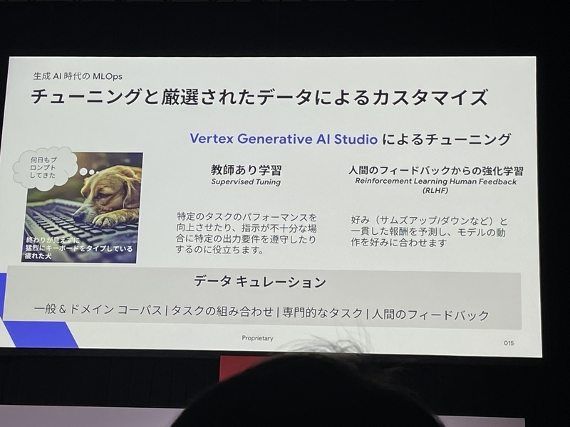 Vertex Generative AI Studioは、「Supervised Tuning(教師あり学習)」と「RLHF(選択やフィーバックなどの)による強化学習」によってチューニングを行います。